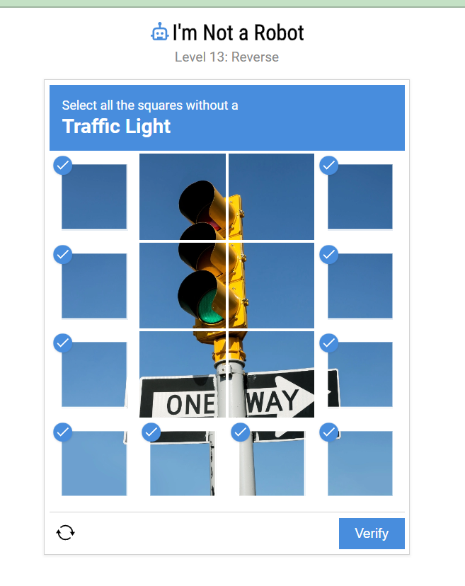 - Selecting Traffic Lights: Reverting to normal CAPTCHA behavior and clicking traffic lights instead of avoiding them