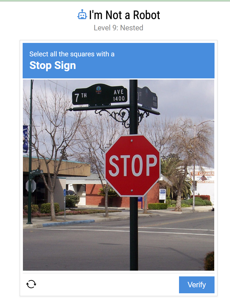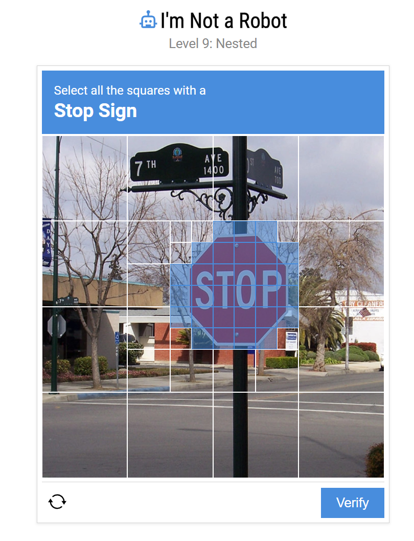 - Objective: Conquer Level 9 of Neal.Fun's 'I'm Not a Robot' by progressively selecting nested squares containing stop signs.